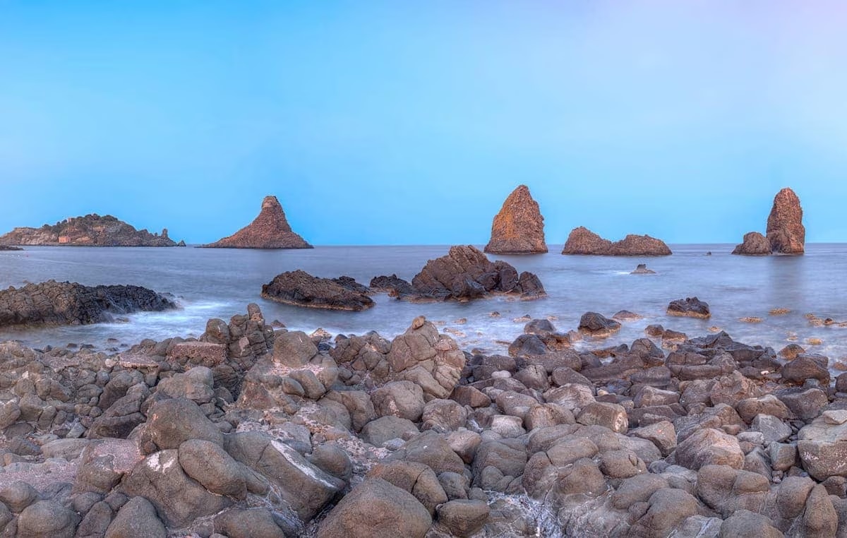A pochi chilometri dal centro di Catania si trova Aci Trezza, affascinante borgo affacciato sullo Ionio e celebre per i suggestivi Faraglioni dei Ciclopi, imponenti formazioni di roccia lavica che emergono dal mare. Secondo la tradizione, questi scogli sarebbero i massi lanciati da Polifemo contro Ulisse, un legame mitologico che contribuisce a rendere il luogo ancora più evocativo. Oggi Aci Trezza è una meta perfetta per una pausa fuori città: scogli neri modellati dalla lava, acque limpide ideali per il bagno e un’atmosfera autentica da borgo marinaro accompagnano il visitatore tra passeggiate sul lungomare, piccole barche da pesca e ritmi lenti che invitano al relax.