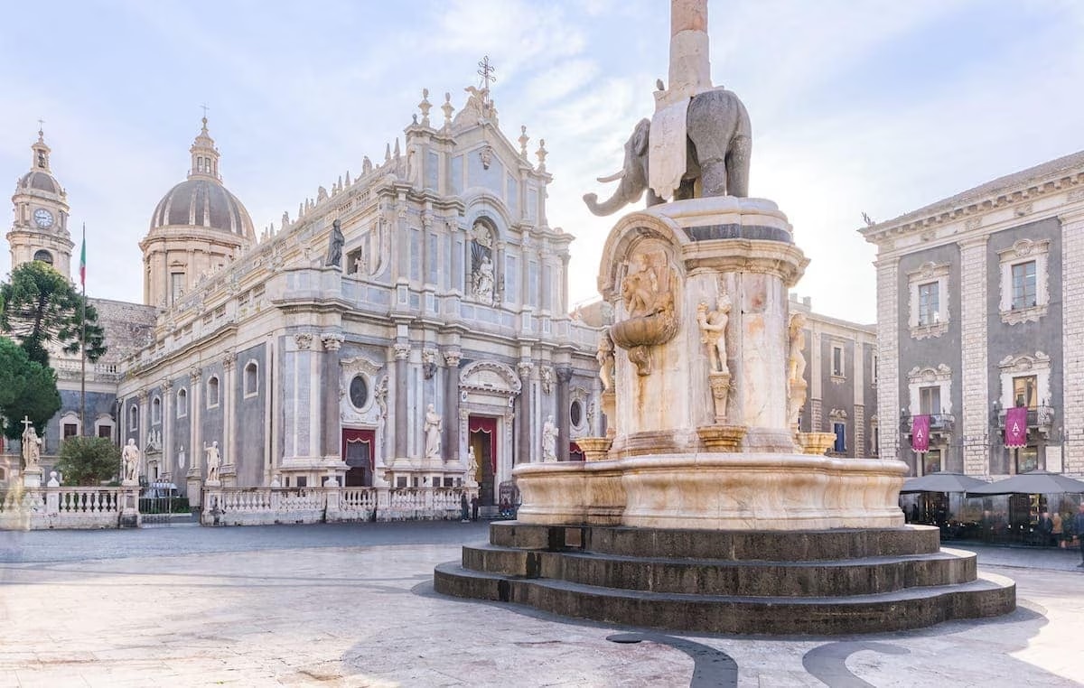 Al centro della piazza cattura immediatamente lo sguardo la Fontana dell’Elefante, conosciuta dai catanesi come “Liotru”, vera icona urbana e punto di riferimento simbolico della città. La statua, scolpita in pietra lavica, sembra emergere direttamente dal cuore vulcanico del territorio e sorregge un obelisco che aggiunge verticalità ed eleganza all’insieme. Secondo una leggenda popolare profondamente radicata nell’immaginario collettivo, l’elefante avrebbe il potere di proteggere Catania dalle eruzioni dell’Etna, agendo come una sorta di guardiano silenzioso. Un racconto simbolico che riflette perfettamente il rapporto intenso, quasi mistico, tra la città e il vulcano: una convivenza fatta di rispetto, timore e identità condivisa, che da secoli plasma il carattere e il destino di Catania.